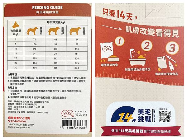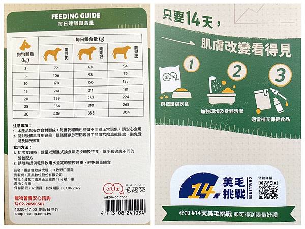 包裝盒上的建議食用量還挺實用的,針對各個毛寶貝體重及增減重需求都有明確的取用量
