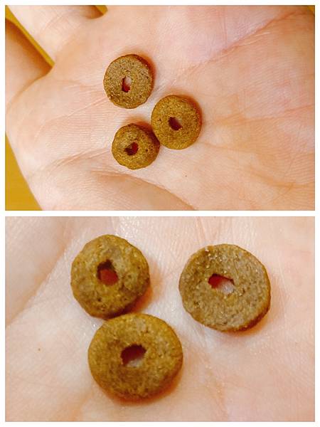兩者寵糧的尺寸跟造型相同,比較沒有大、小型犬入口的問題