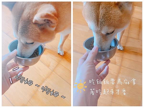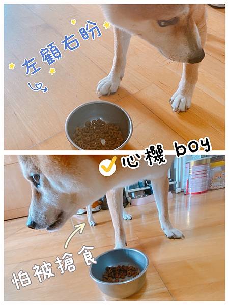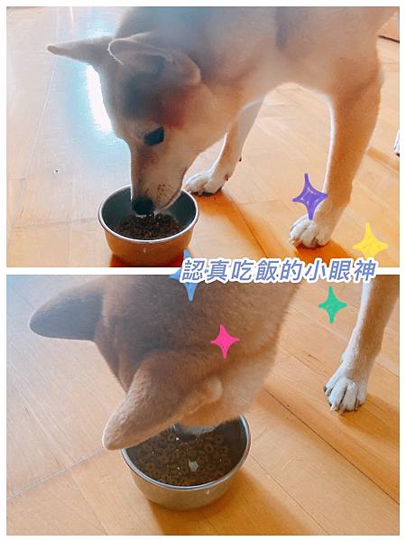 (最近正在訓練牠飯碗放下前坐下等等,看那如坐針氈的表情也太可愛了~)
